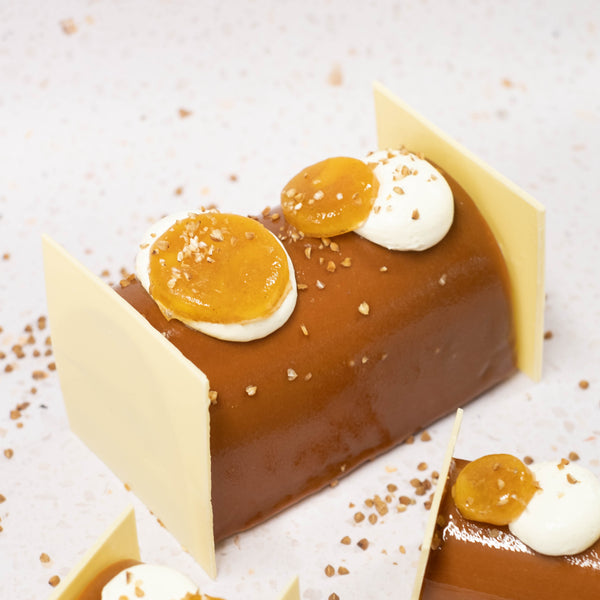 Une bûche originale avec son biscuit moelleux au sarrasin, des pommes tatin et une mousse caramel.