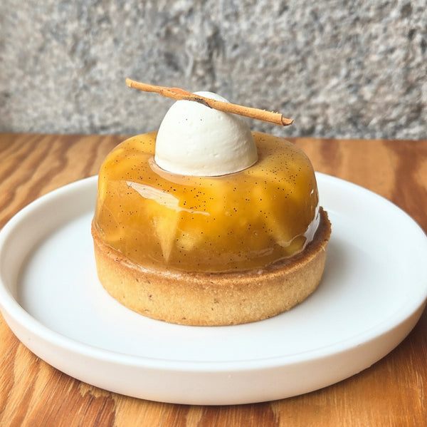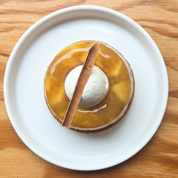 Pâte Sucrée, Biscuit Moelleux aux Amandes, Crémeux Cannelle, Pommes Tatin, Chantilly Vanille, Croustillant Cannelle.