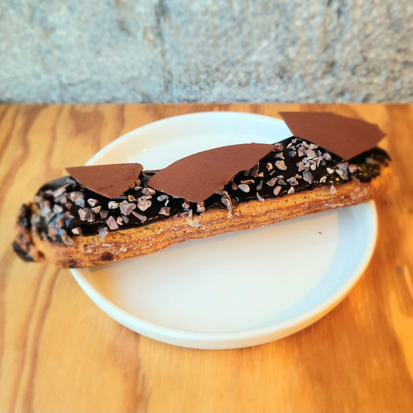 Pâte à Chou, Crème Pâtissière Chocolat Pérou 65%, Fondant Cacao, Grué de Cacao, Fines Feuilles de Chocolat