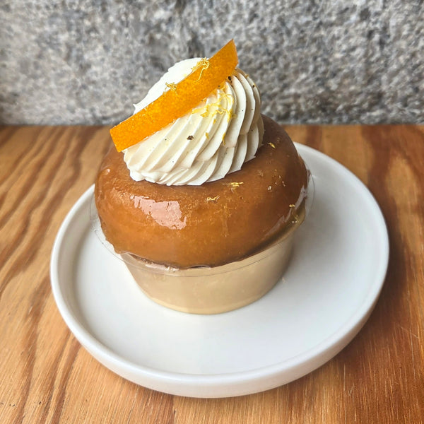 Uniquement le week-end.Composition :Pâte à savarin Maison, Imbibage Gin Cotswolds, Confit citron yuzu, Segment pomelo, Nappage Abricot, Orange confite, Chantilly vanille.